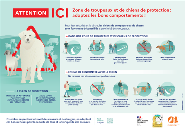 Les panneaux de sensibilisation permettent d’informer tous les usagers de la montagne sur la présence de chiens de protection de troupeau et la conduite la plus adaptée à avoir à l’approche d’un troupeau.